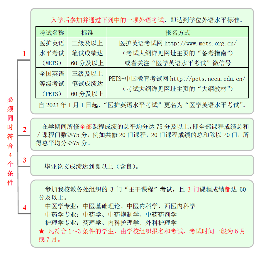 入学后参加并通过医护英语水平考试(METS)、全国英语等级考试(PETS)的其中一项外语水平考试,即达到学位外语水平标准。
