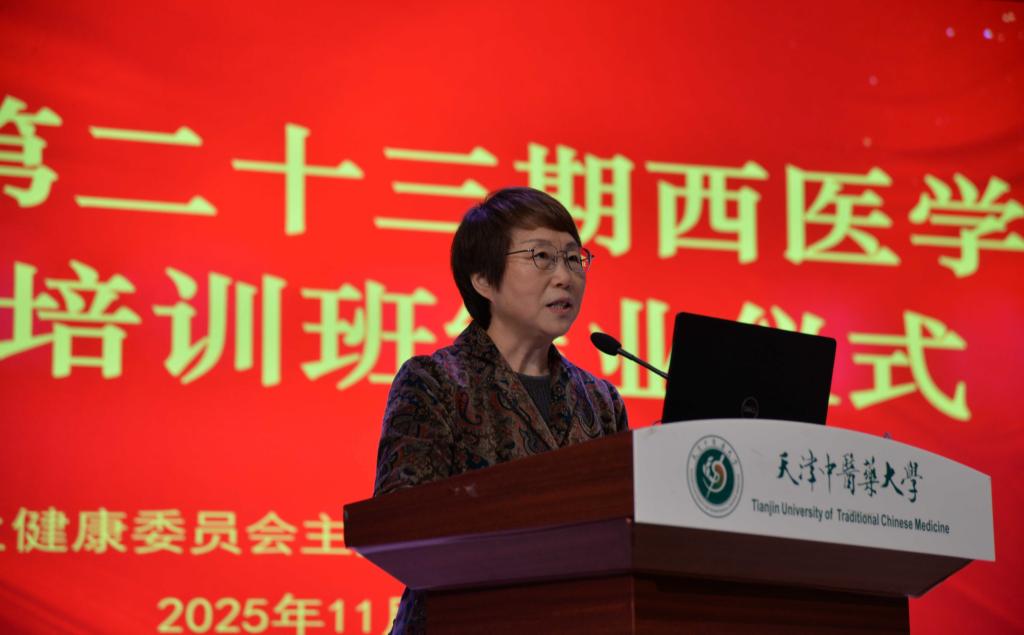 随后,天津市卫生健康委中医综合处苏菁处长致辞,她强调:举办“西医学习中医”培训班,正是我市深入贯彻落实国家中医药发展战略,推动中西医协同发展,提升中医药服务能力的重要举措。其目的就是要培养一批既掌握现代医学知识,又精通中医理论和技能的高层次复合型医学人才,使中西医相互补充、协调发展,为人民群众提供更加优质、高效、全方位的医疗健康服务。 同时,苏菁处长肯定了本期学员的学习成果,并对我市卫健委相关政策再次进行宣传解读,鼓励学员们以此次培训为新的起点,将所学的中医药知识和技能灵活运用于今后的临床实践之中,坚持中西医并重,不断提升我市医疗诊疗水平和服务能力。