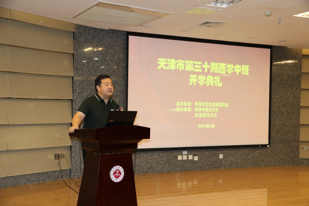 张健院长致欢迎辞。他指出,西学中培训班贯彻落实国家中医药发展战略的重要举措,旨在培养一批既掌握现代医学知识又精通中医理论的复合型人才,推动中西医结合事业的创新发展。同时,就培训班学习安排和纪律提出要求,强调本期培训课程2年,内容丰富,涵盖中医基础理论、经典研读、临床实践等多个模块,学员要按时参加线上线下课程、完成作业并通过考核。希望学员们以严谨的态度对待学习,以创新的思维探索中西医结合的新模式,为天津市医疗卫生事业发展注入新活力。