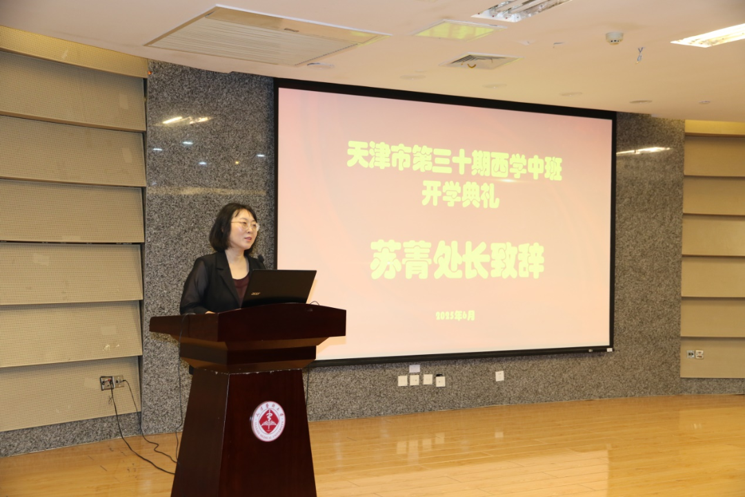 苏菁处长在讲话中指出,西学中项目是天津市深化医药卫生体制改革的重要内容,也是促进中医药传承创新的重要抓手,具有推动中医药事业高质量发展里程碑的意义。她提到,随着科学进步,AI助力中医药发展,她期望学员坚定信念,深刻认识中西医结合的重要意义,以本次培训为起点,未来在中西医结合领域发挥更大的作用,为健康天津建设贡献力量。